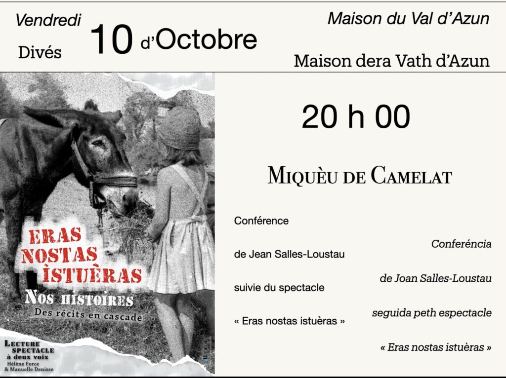 Eth lendoman, divés 10 d’octobre a Arrens, a ueit òras deth ser (20h), que’s tiérà ua serada ath torn de Miquèu de Camelat, vietz escotar a Joan Salles-Loustau qui nse parlarà de Miquèu de Camelat. En seguint eth espectacle (en francés) « Eras nostas Istuèras », que serà dat.