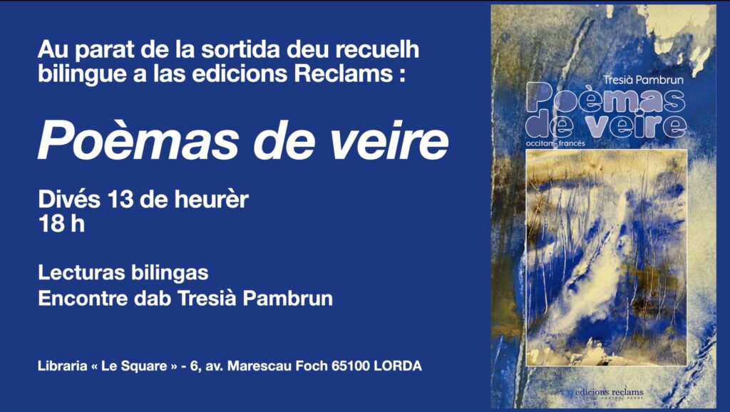 Presentacion de Poèmas de veire recuelh de poèmas de Tresià Pambrun. Lecturas bilingas, escambi dab l’autora e pausa conviviau.
